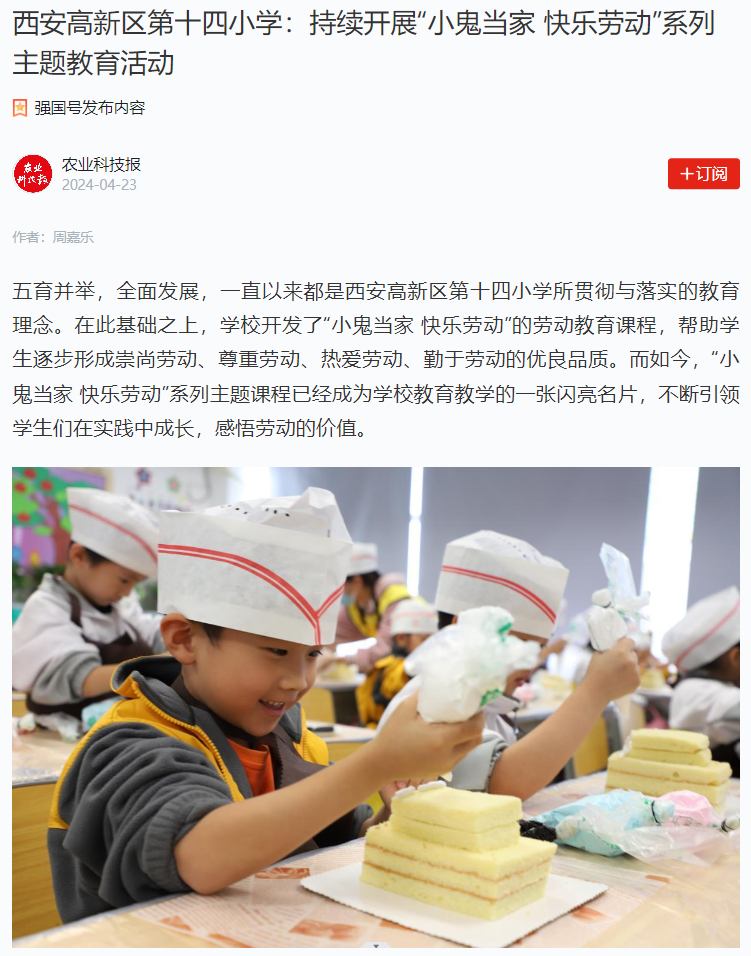 五育并举,全面发展,一直以来都是西安高新区第十四小学所贯彻与落实的教育理念。在此基础之上,学校开发了“小鬼当家 快乐劳动”的劳动教育课程,帮助学生逐步形成崇尚劳动、尊重劳动、热爱劳动、勤于劳动的优良品质。而如今,“小鬼当家 快乐劳动”系列主题课程已经成为学校教育教学的一张闪亮名片,不断引领学生们在实践中成长,感悟劳动的价值。